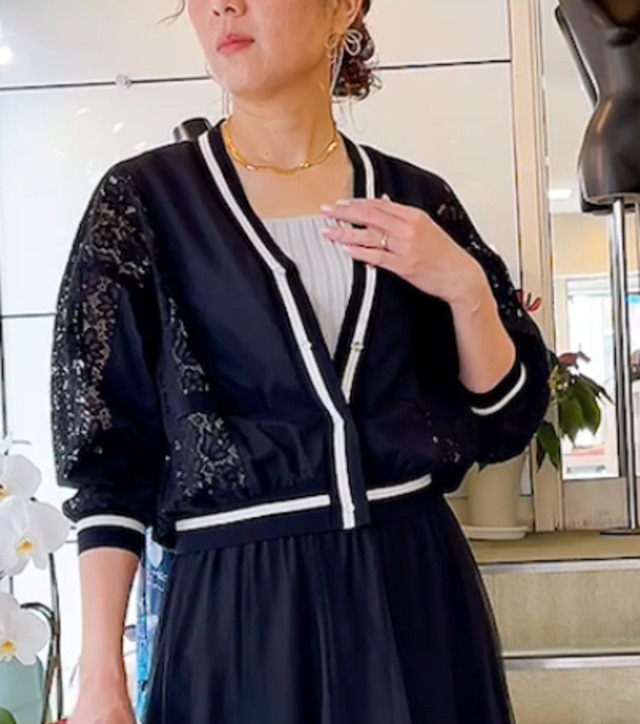 コットン生地とレース生地がドッキングされた、カーディガン風に着られるジャケットです。 ブラックにホワイトのラインがポイントになり、カジュアルにもきれいめにも活躍します。 薄手で軽量の素材感なので、晩夏初秋にもおすすめの一枚です 【カラー】 ブラック 【サイズ】 01サイズ 身幅…53cm 着丈…56cm 肩幅…58cm 袖丈…40cm 【素材】 (本体) 綿100% (レース) ナイロン70% 綿30% (リブ) レーヨン65% ナイロン35% サイズ表記は平置きにしてメジャーで採寸している為、誤差が生じることがあります。 ご了承下さいませ。 【在庫切れの場合】 この商品は当店の実店舗でも販売しております。 在庫数の更新は随時行っておりますが、タイムラグなどにより、ご購入いただいた商品が先に店頭で売れてしまっている場合もございます。 *もし店頭の在庫切れとなってしまった場合は、すぐにご連絡いたします。ご理解賜りますようよろしくお願いいたします 【色について】 画面によって色の見え方が異なります。 画面で見ている色と、お届けの商品の色が少し違ってしまう可能性がございますが、ご了承くださいませ。 【ご返品・交換について】 商品に欠陥がある場合は返品・交換に応じさせていただきます。 イメージと違った、サイズが合わなかった等のお客様ご都合によるキャンセル・交換は応じかねますので予めご了承下さいませ。