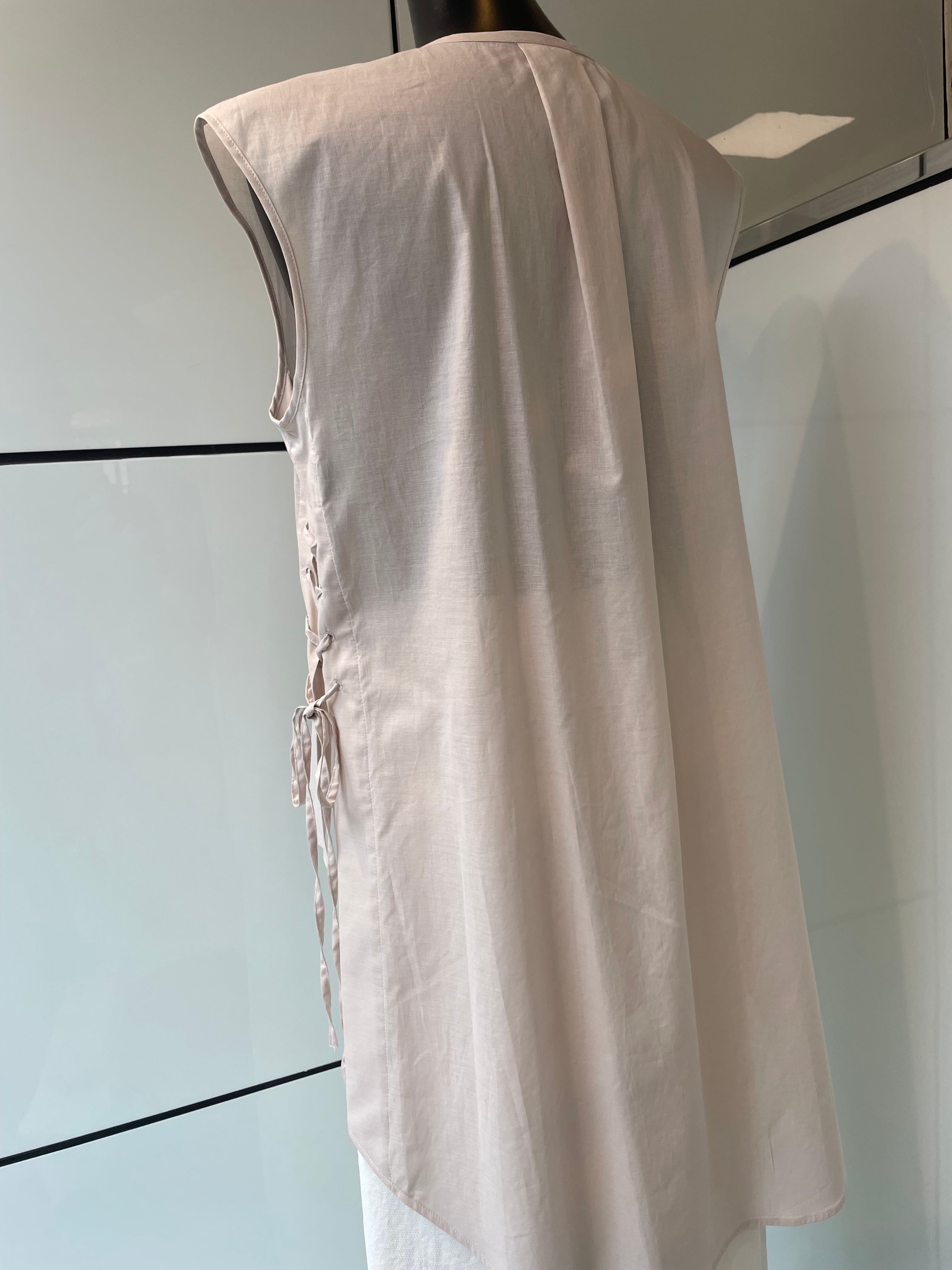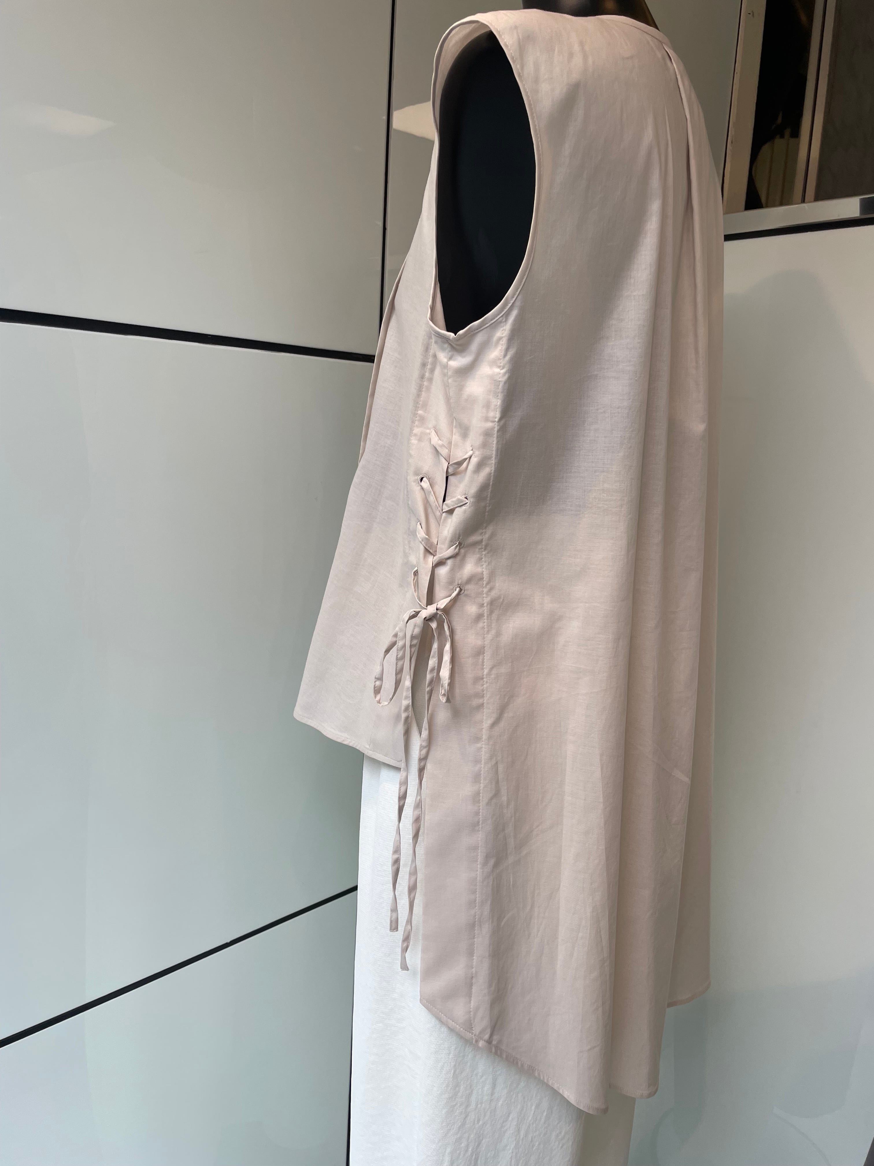 大胆な前後差とサイドのレースアップが特徴的なノースリーブブラウスです。