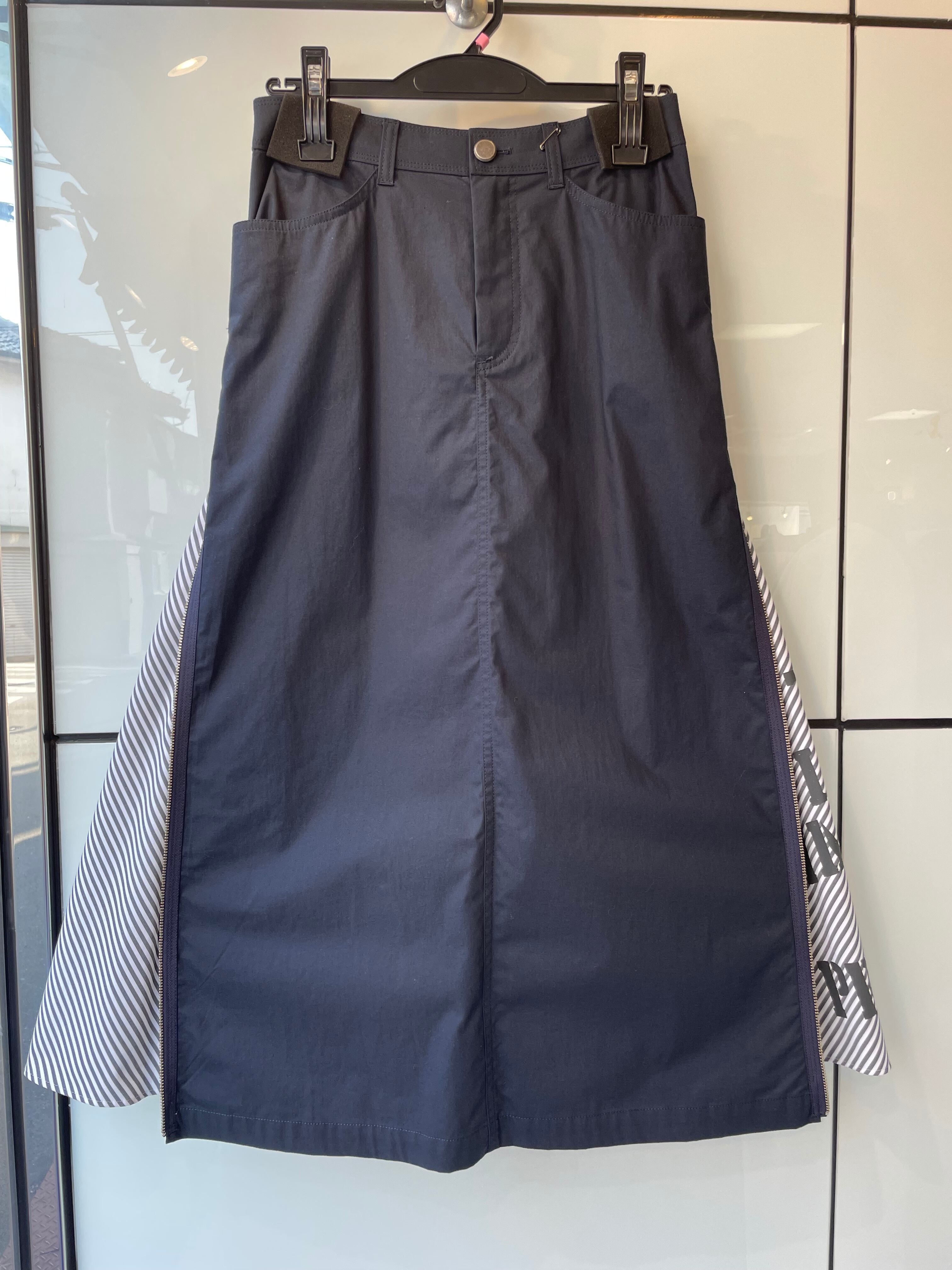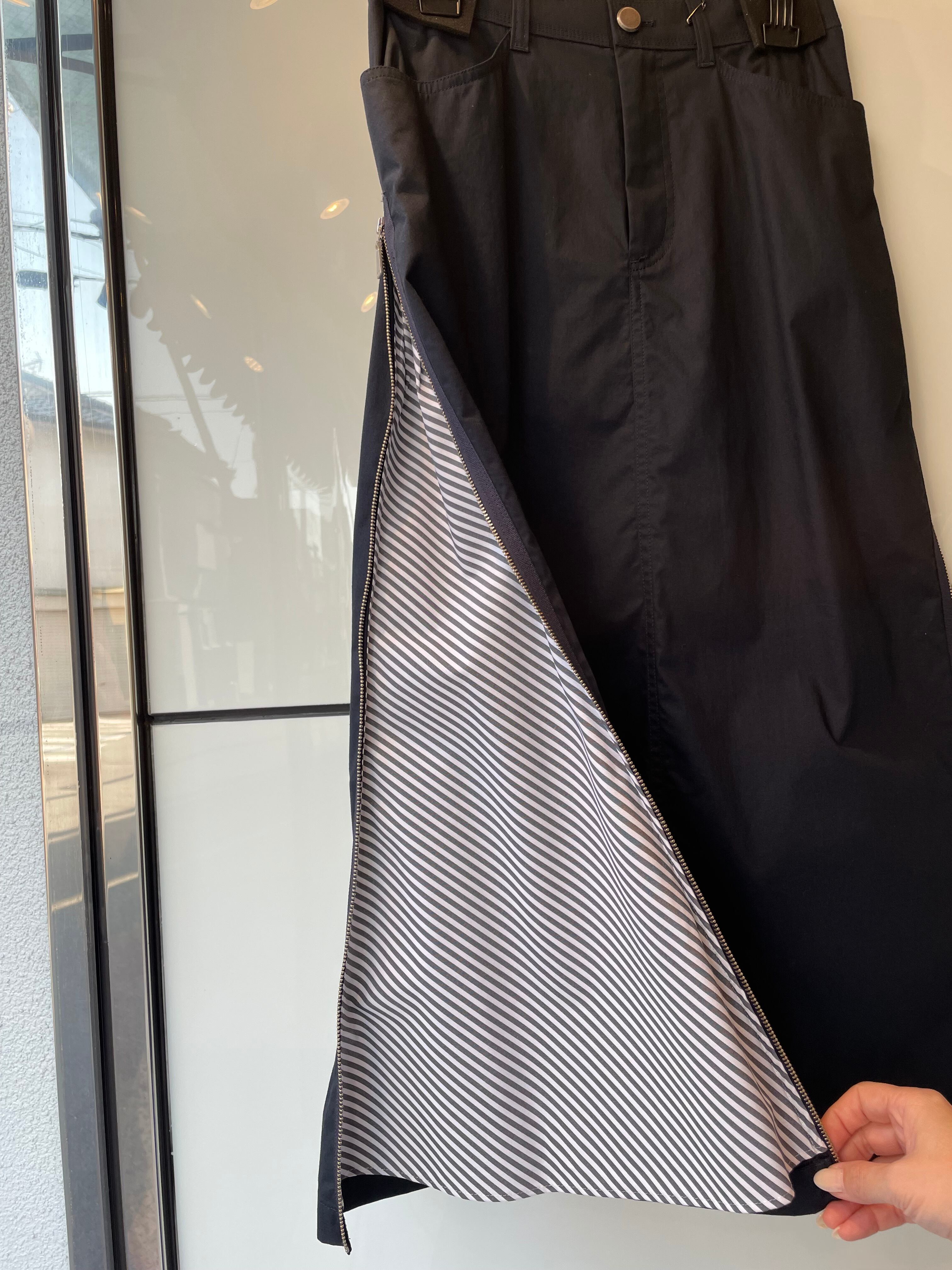 両サイドのファスナーの開閉で、シルエットとデザインに変化をもたらせてくれる2WAYスカートです。