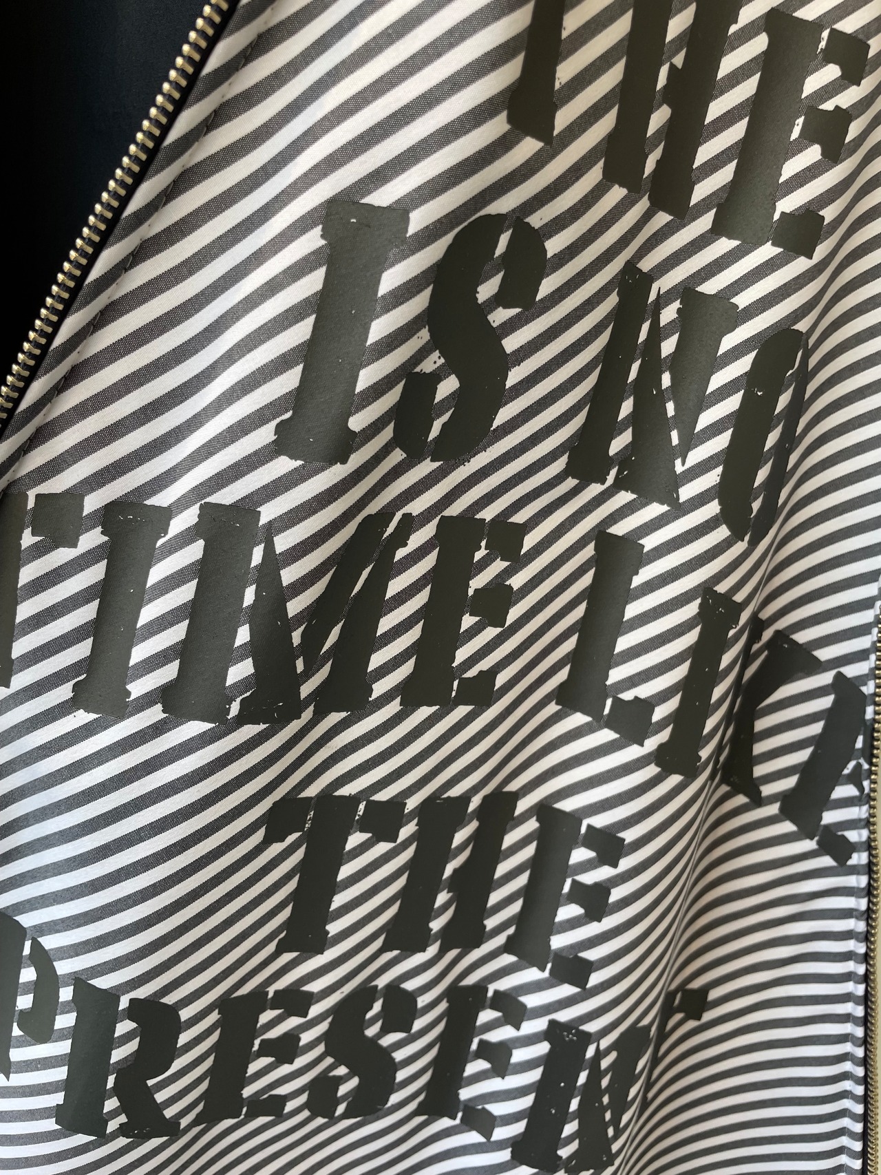 ファスナーを閉めてタイトスカートに、開けると中から配色の生地が顔を出し、左右で表情が異なる個性的な1枚です