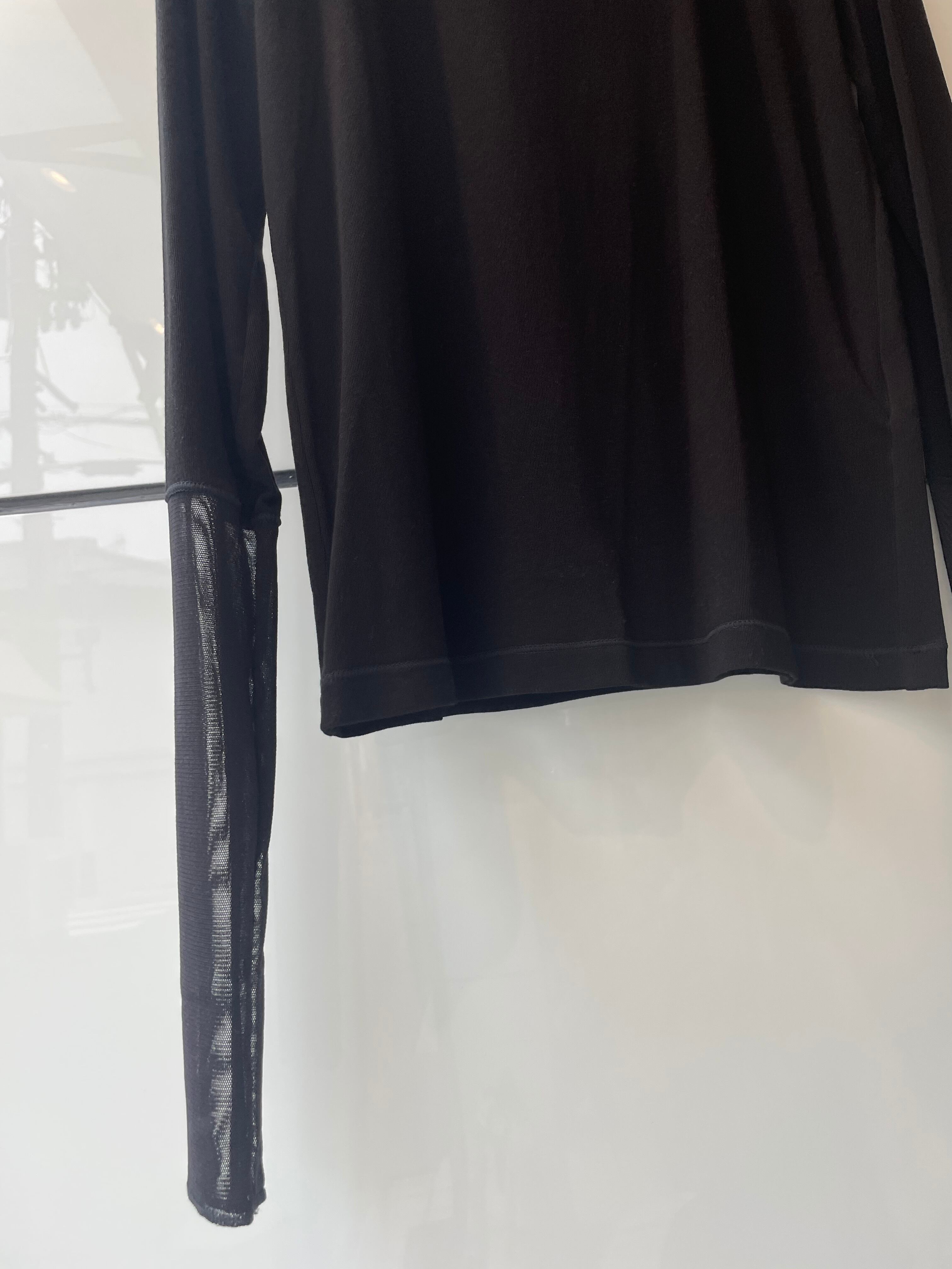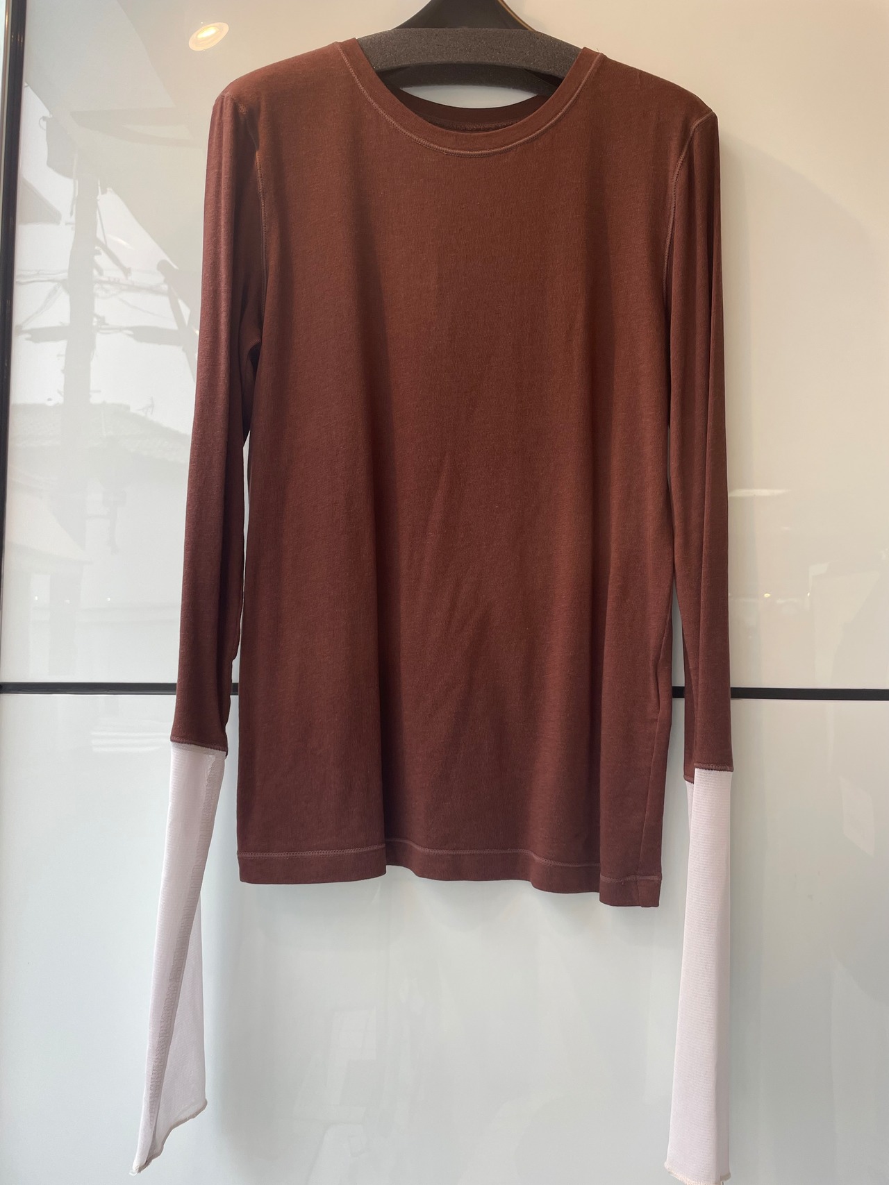 袖口で切り替えたシアー生地が配色となり、個性的なインナーとして活躍する1枚です。