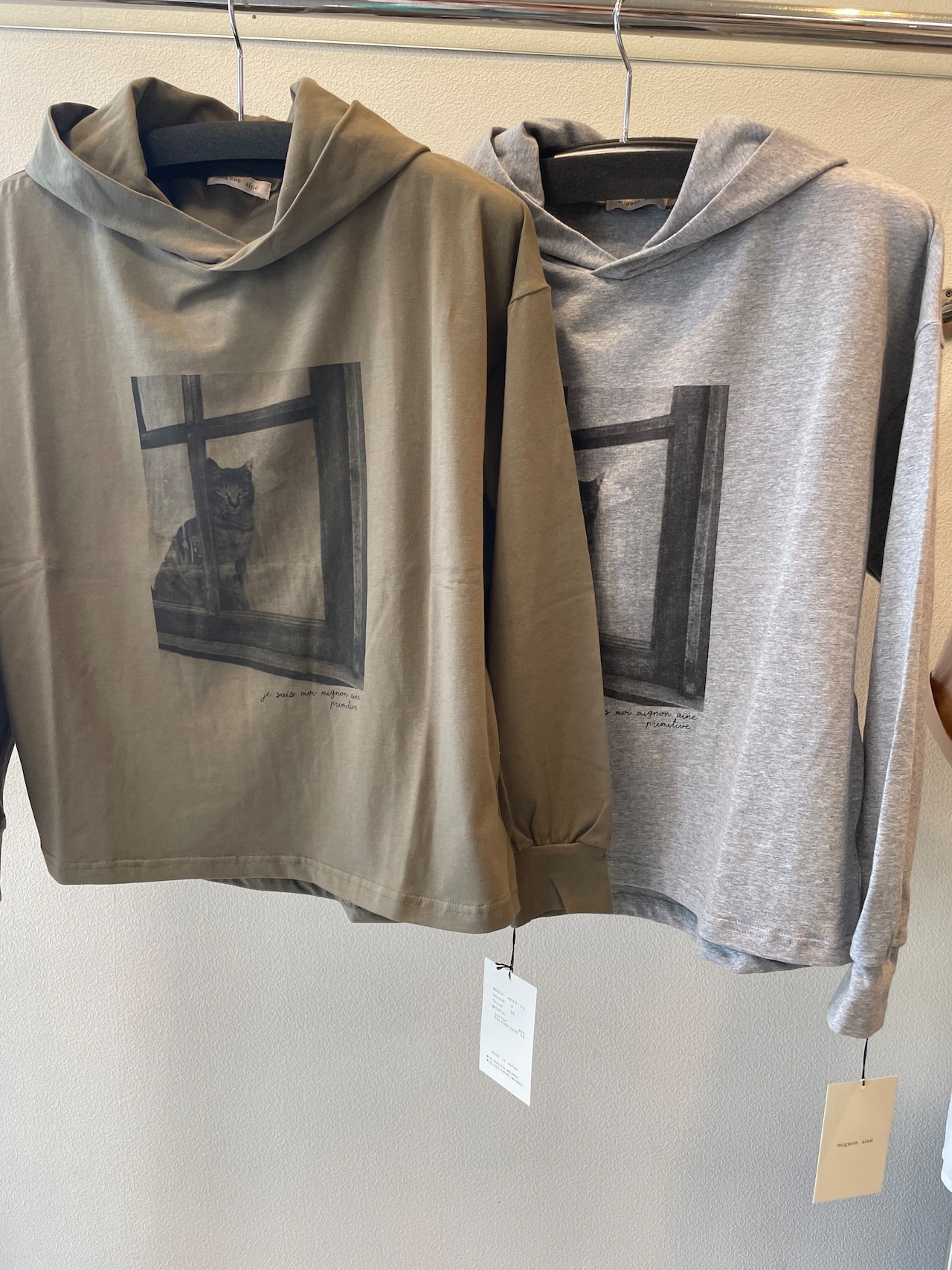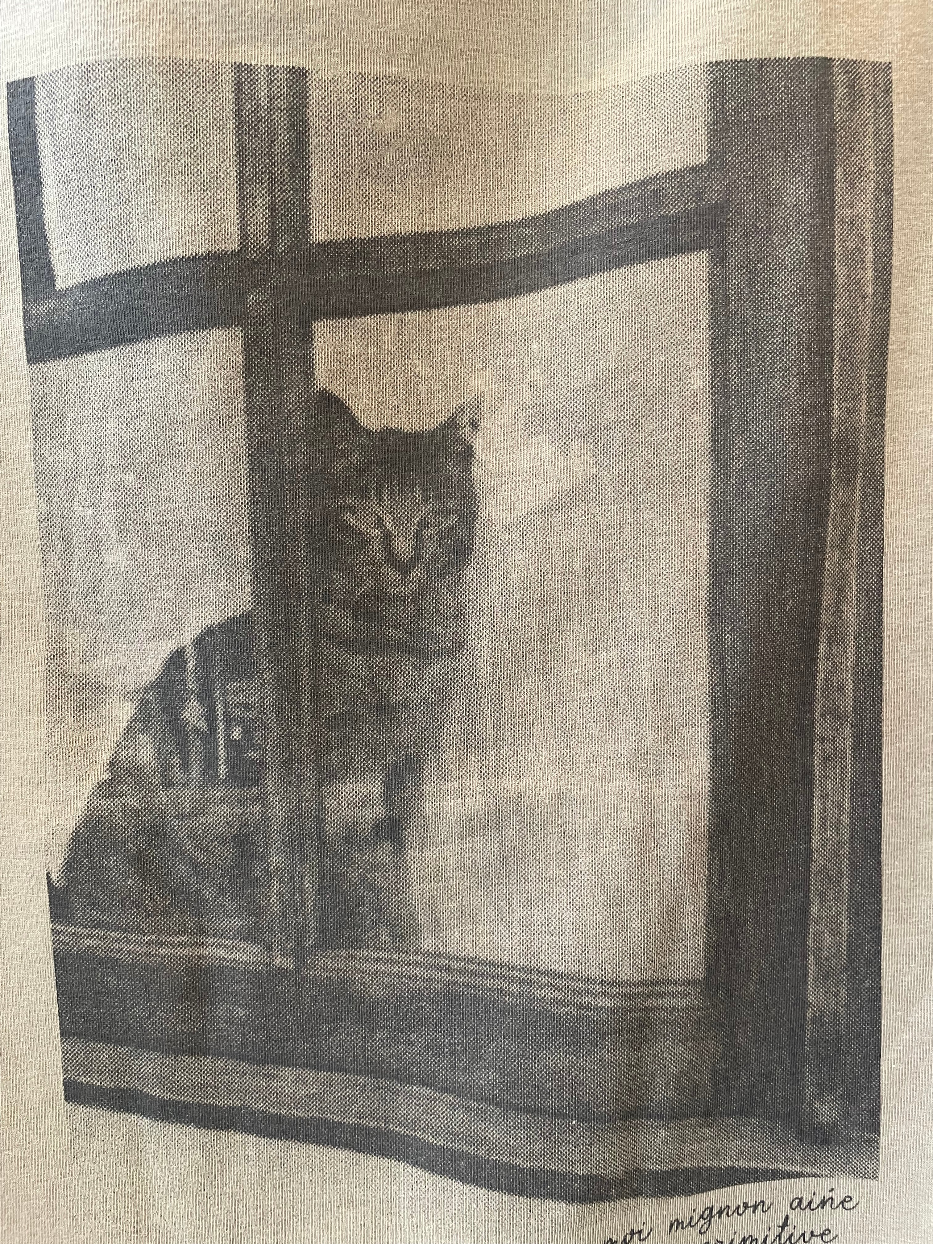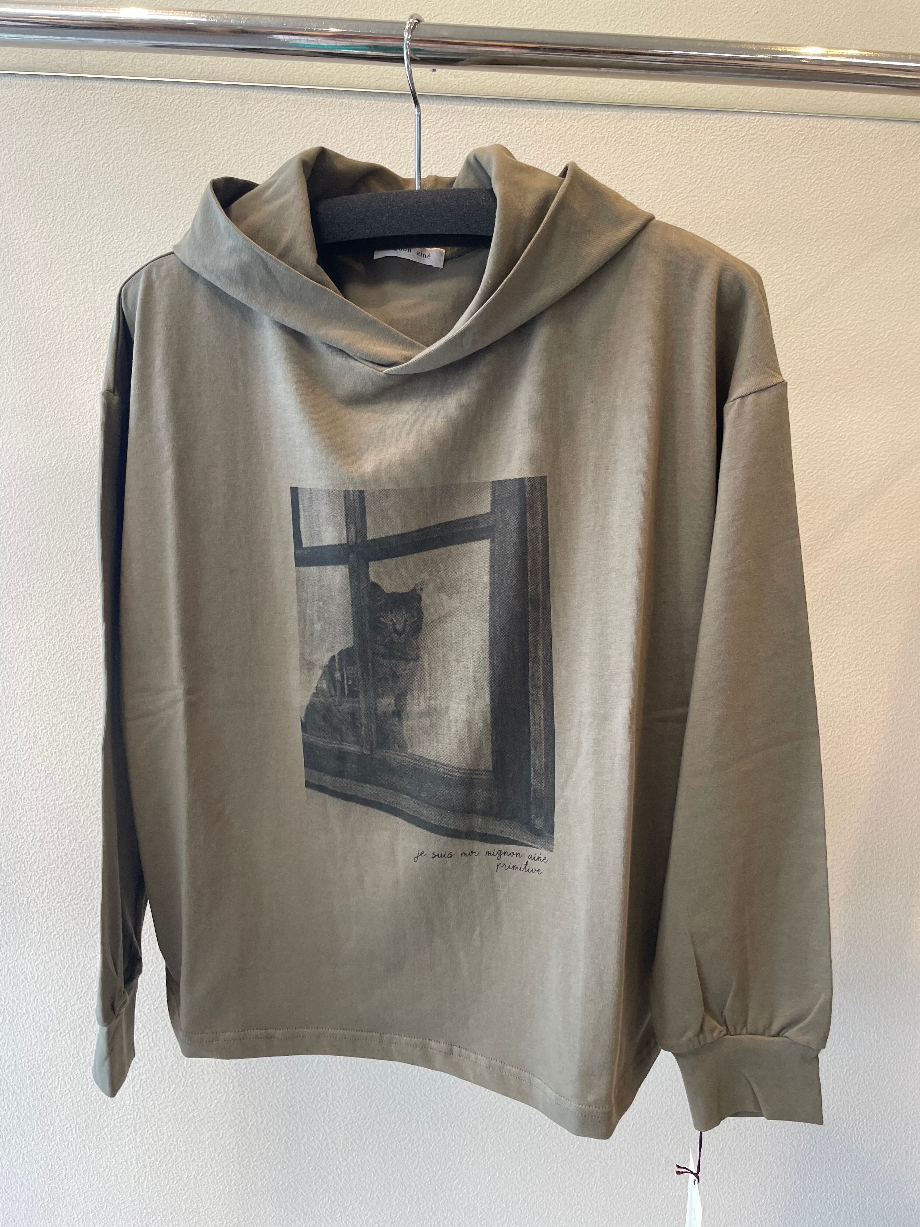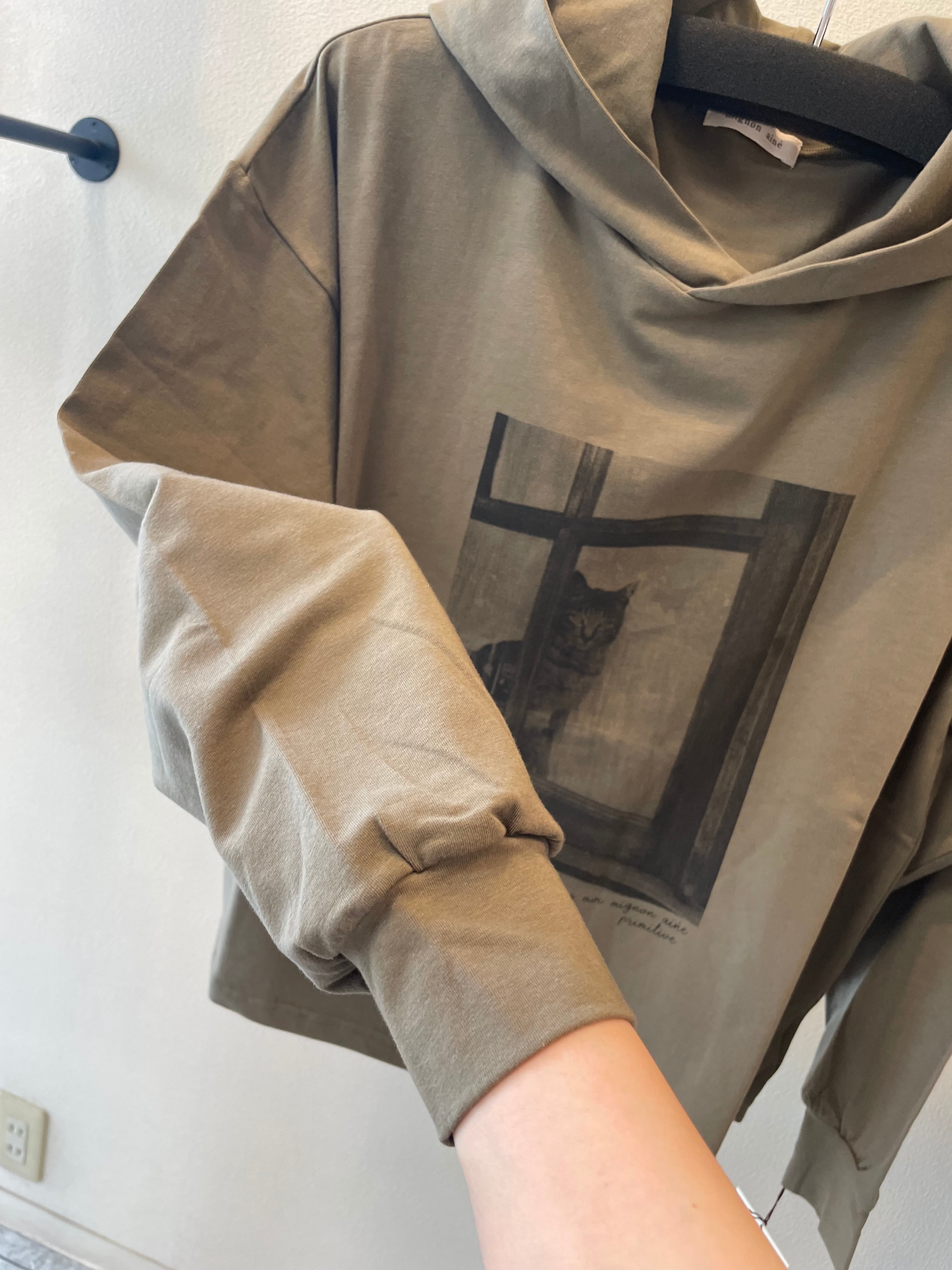 窓辺からのぞく凛とした猫の写真が目を惹くフーディTシャツです