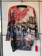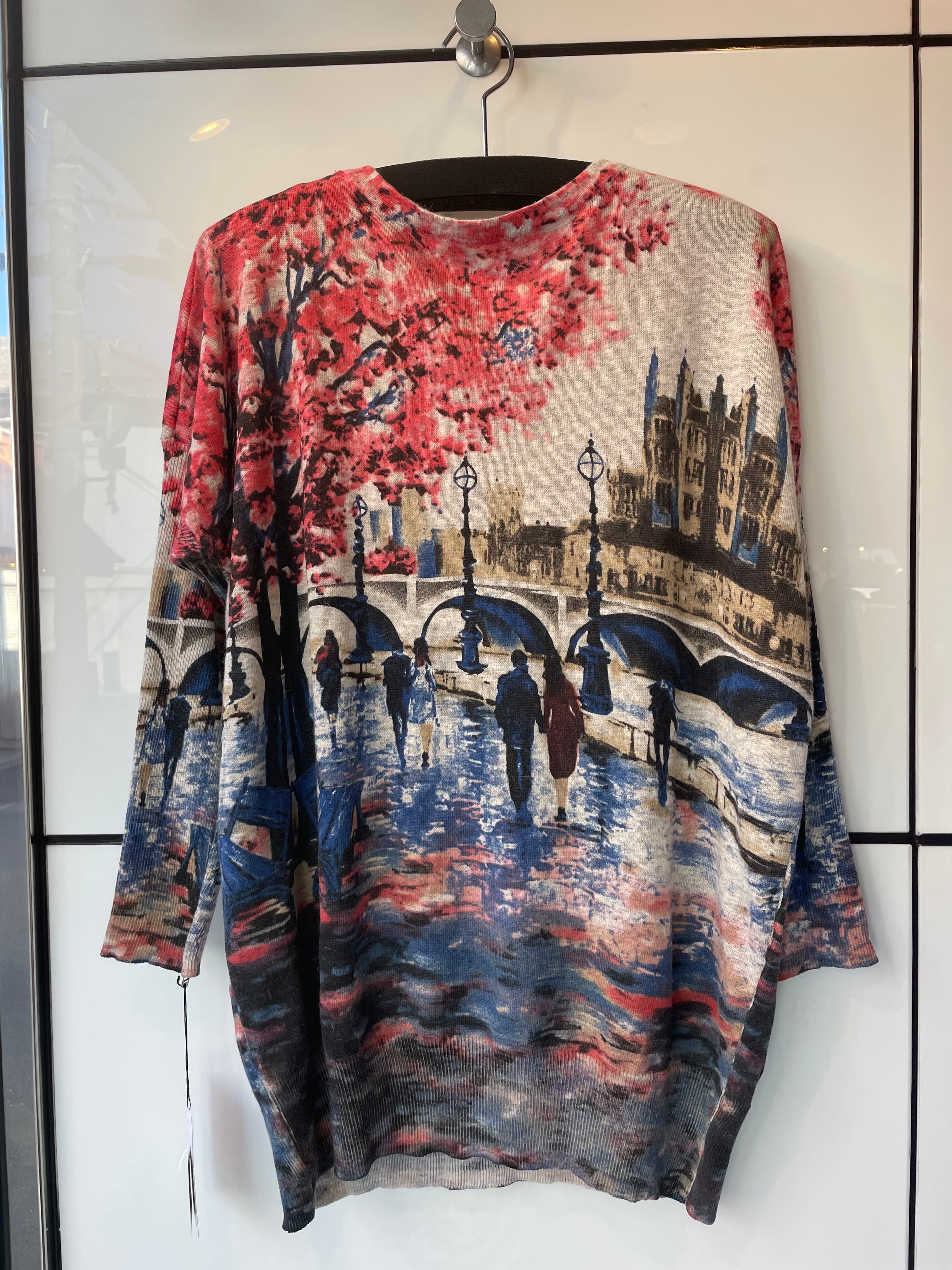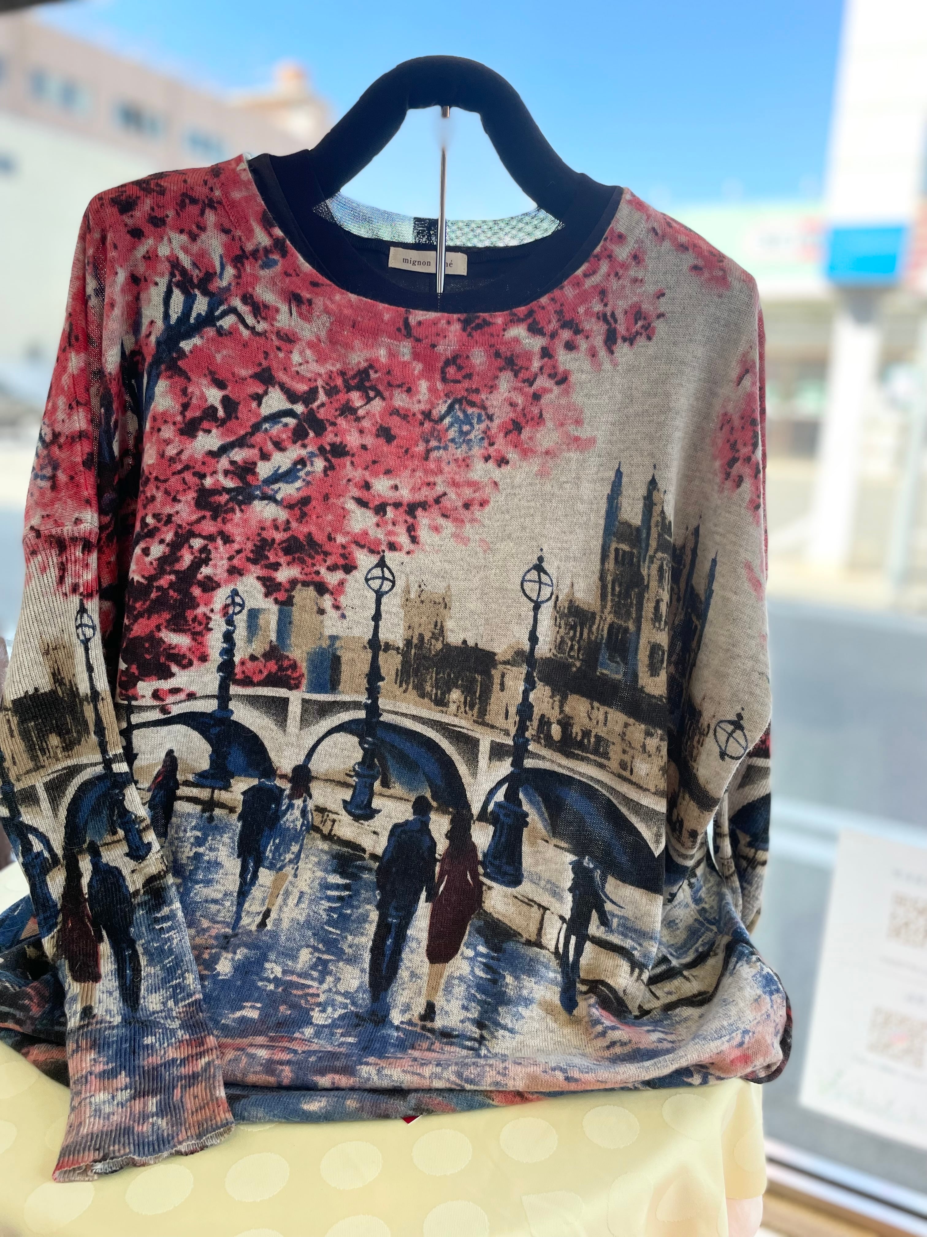 個性的な景色のプリントが施されており、他にはないスタイルを生み出します。シンプルながらも印象的なデザインで、さまざまなコーディネートに使える一枚です。