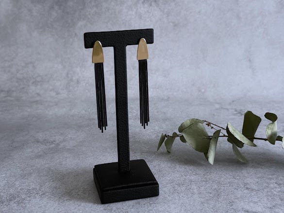 ゴールドから6本のブラックのフリンジが揺れる、きりっとした印象のロングピアスです