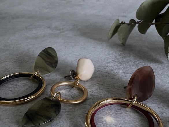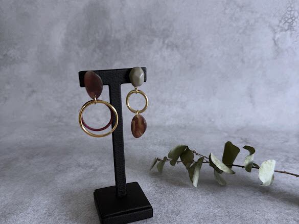 アクリルパーツ、ファーリング、ゴールドリングが左右非対称にデザインされたおしゃれなピアスです