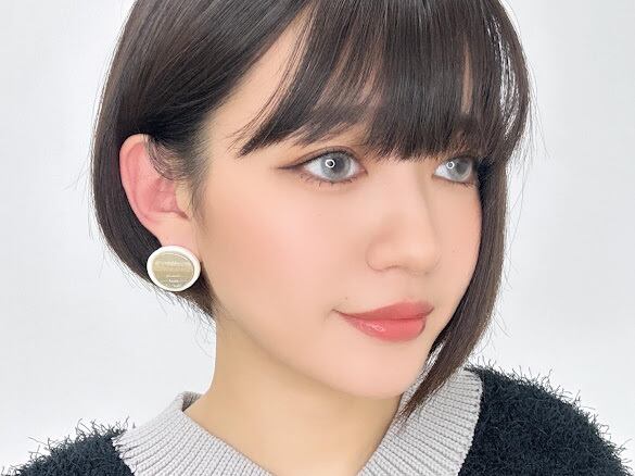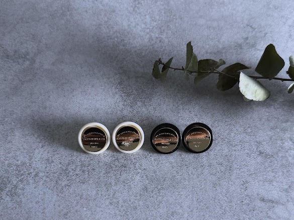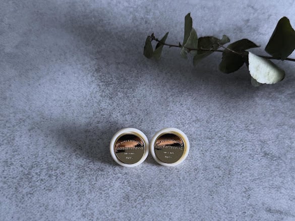 ゴールドのロゴプレートと、アクリルプレートが重なり合ったおしゃれなピアスです