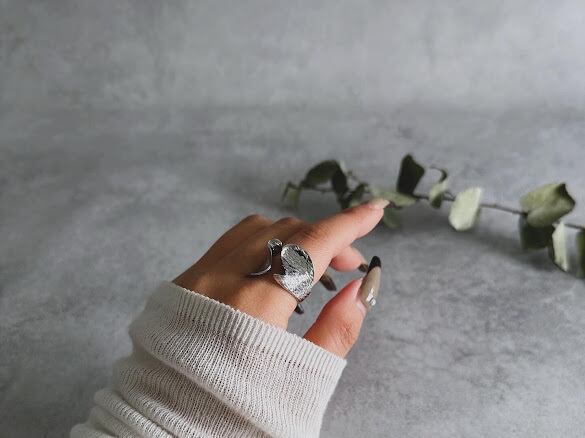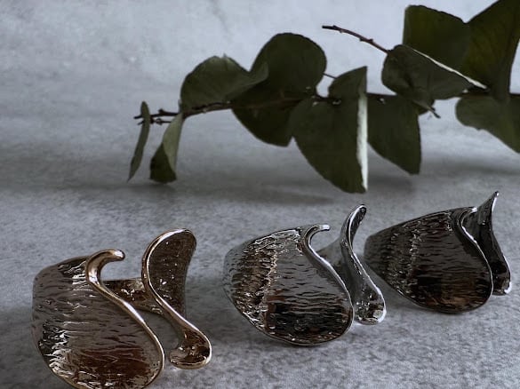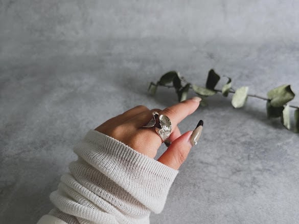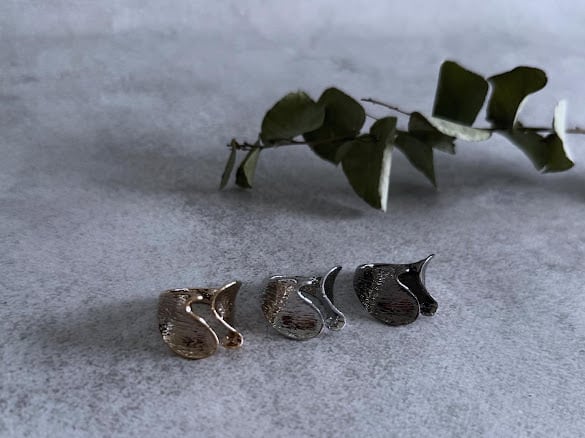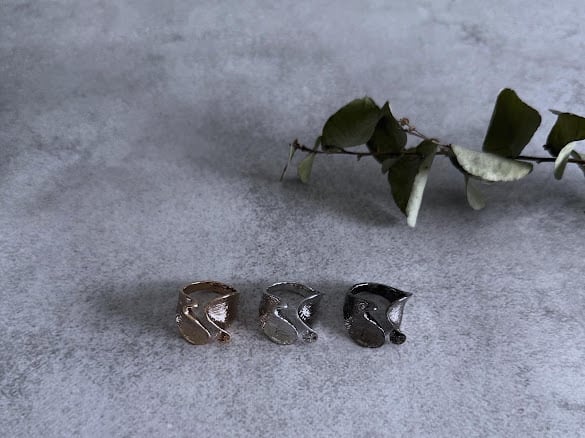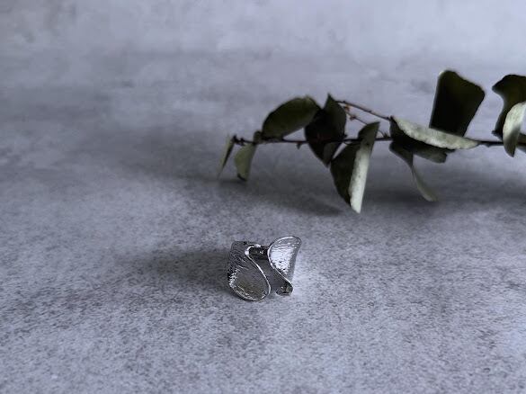 フリルや花びらの方なユニークなデザインが特徴的なリングです