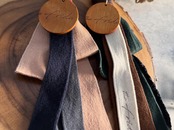 色とりどりのテープを使い、ウッド調のロゴプレートがポイントのチャームです。