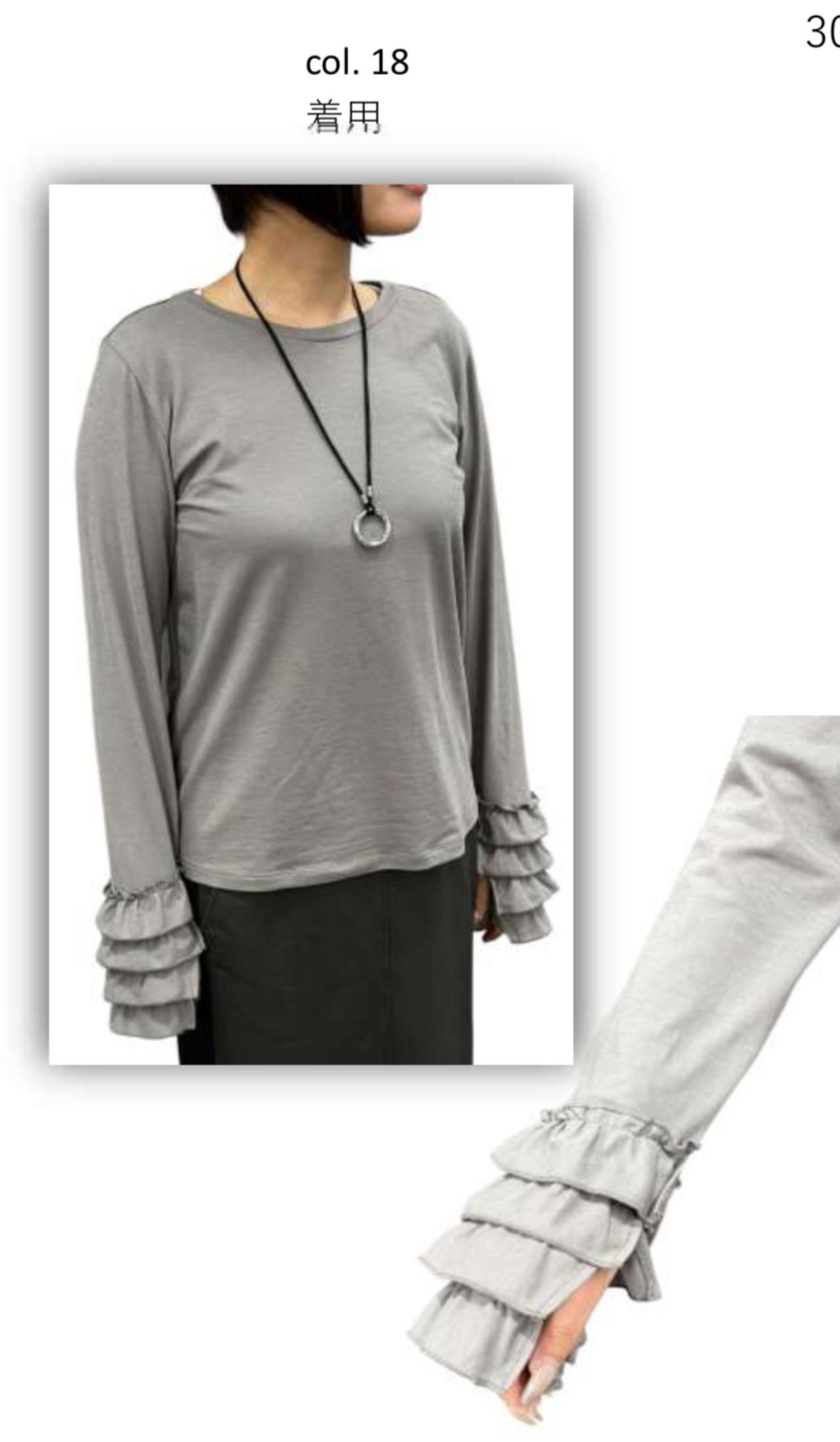 袖口に施されたフリルデザインがレイヤードコーデを引き立たせ、シンプルながらも華やかな印象を与えてくれます。