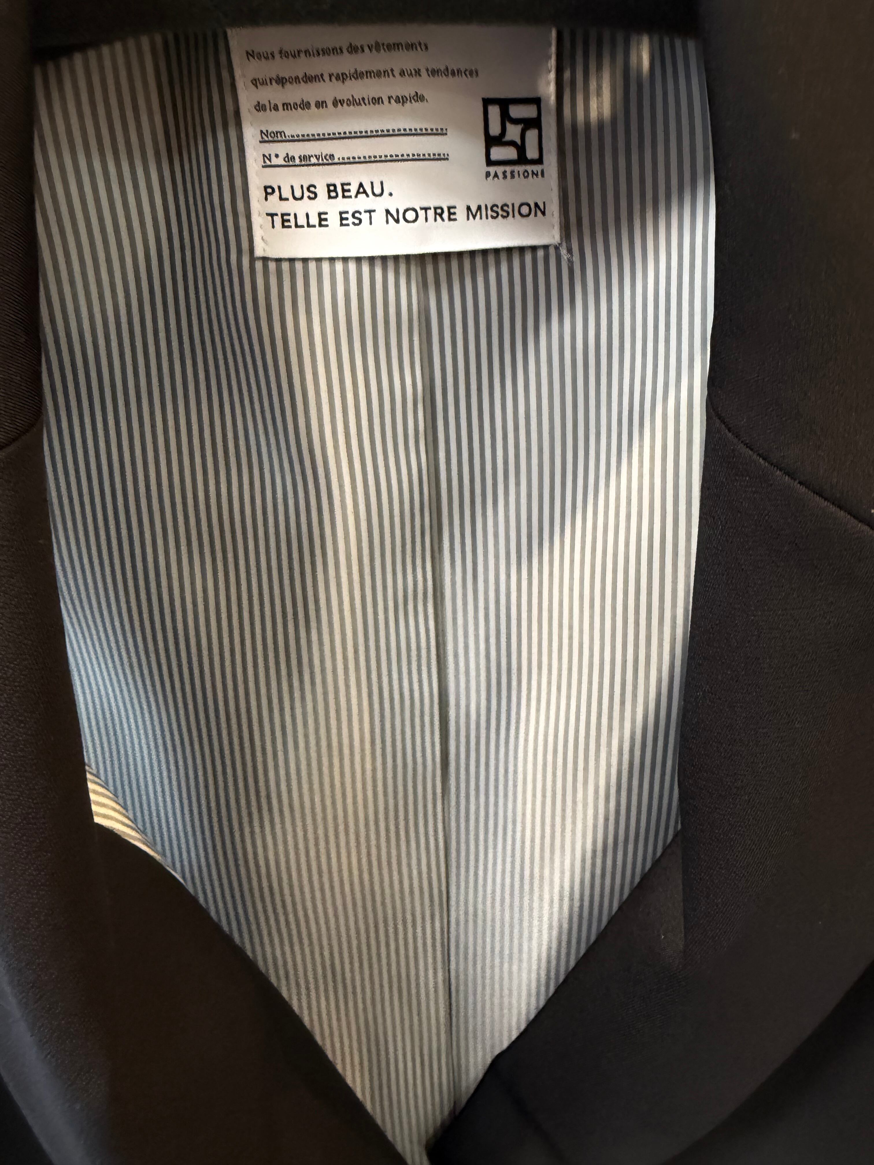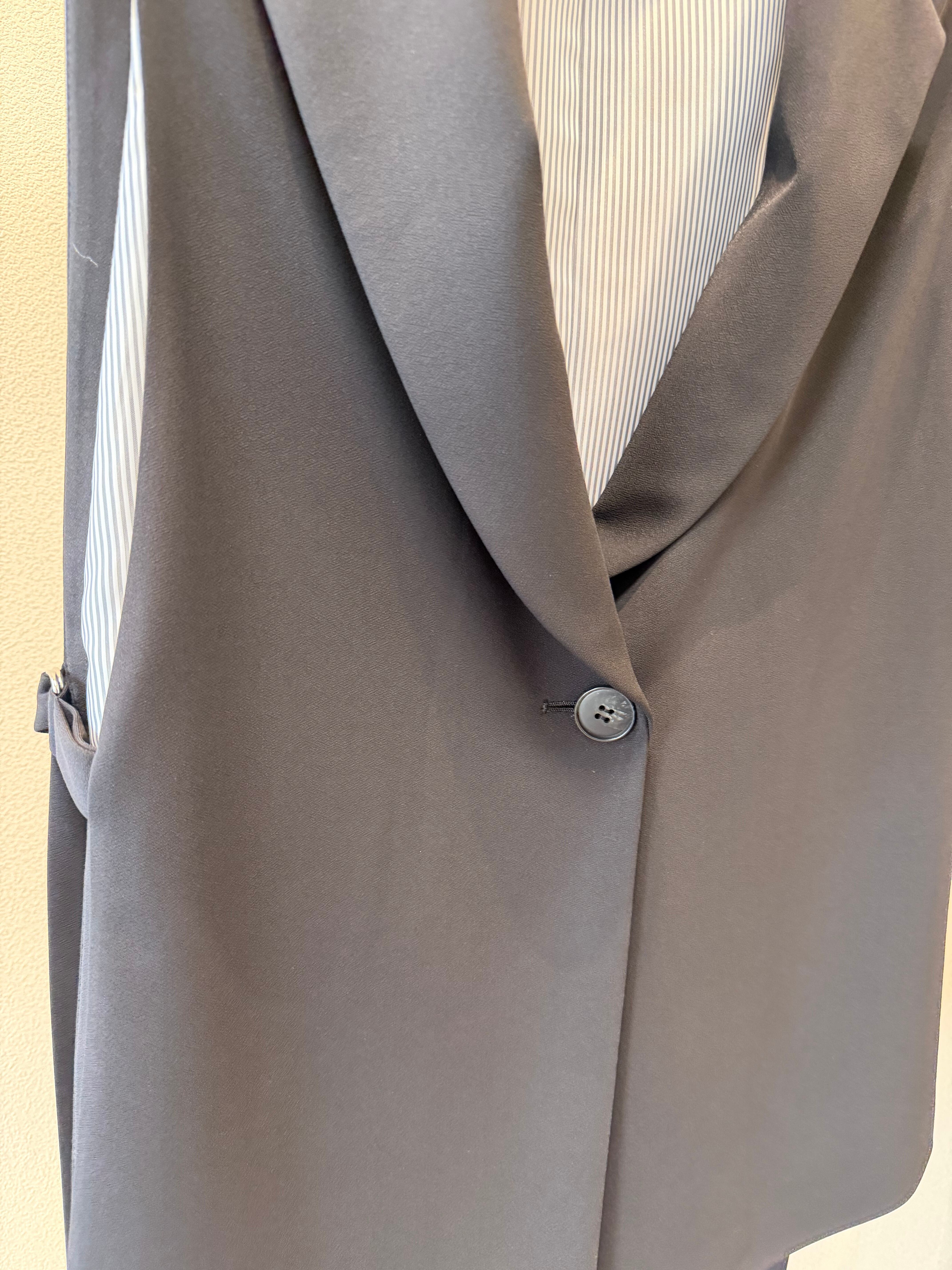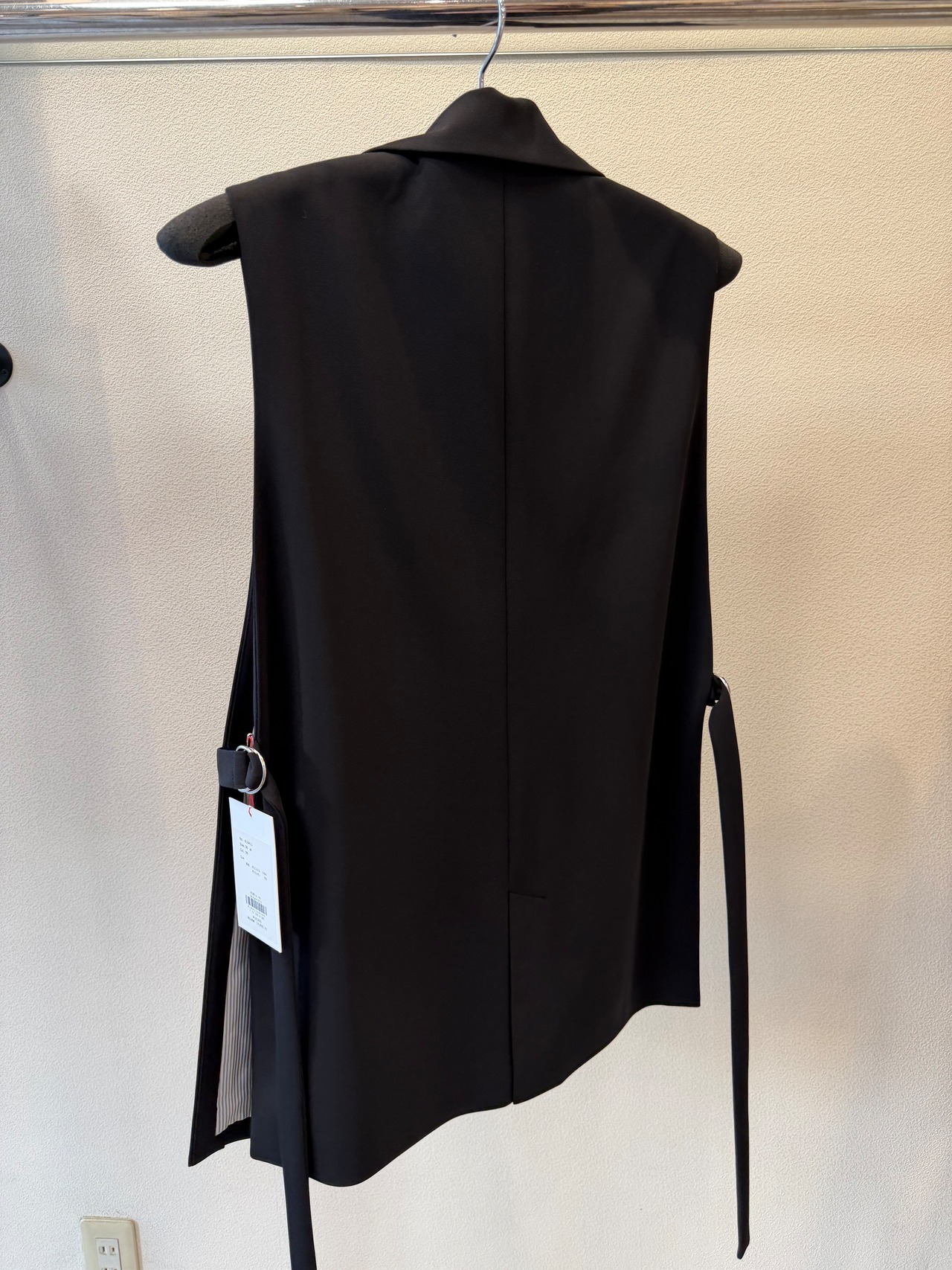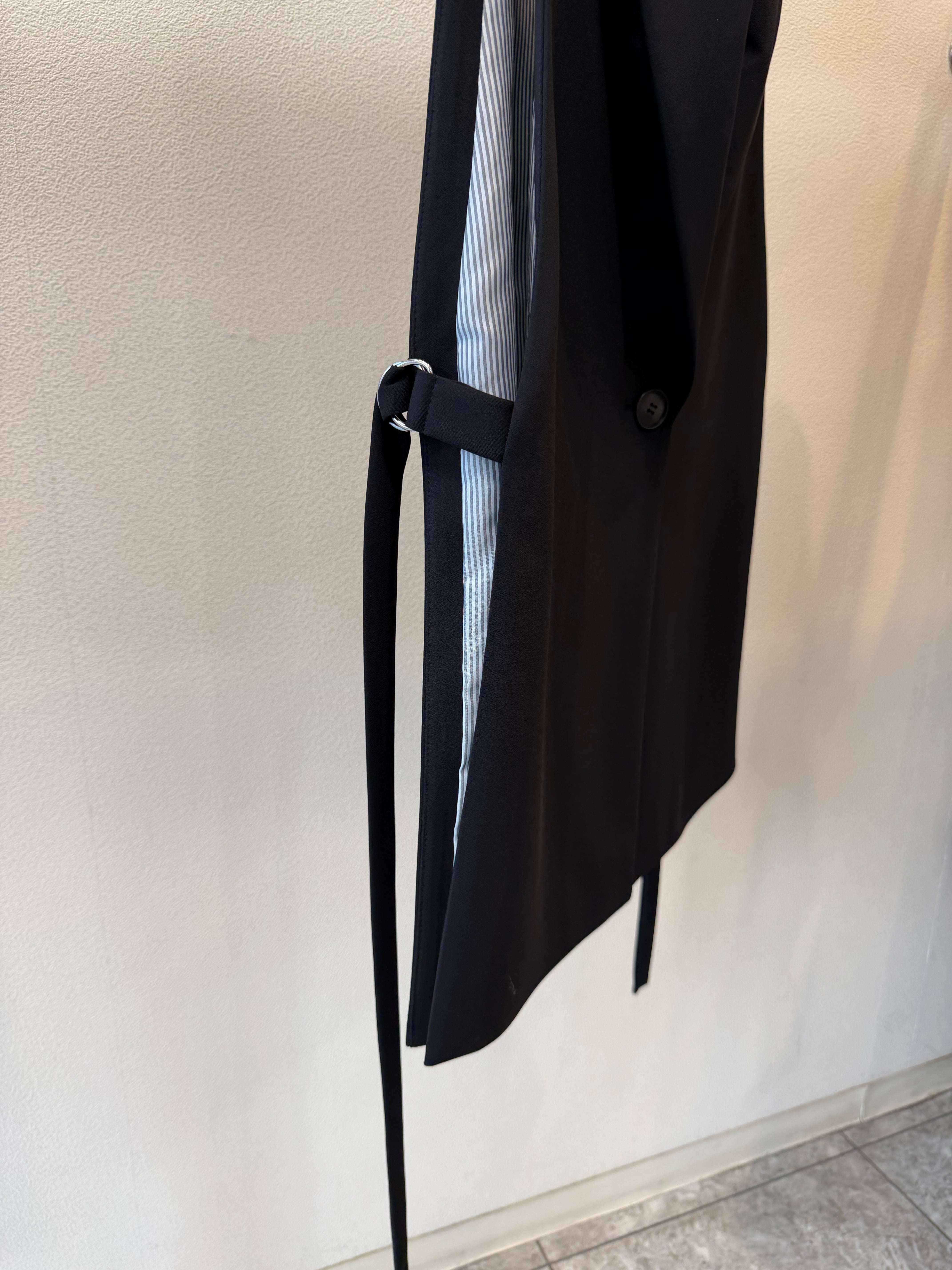 ポイントになっているサイドの共布の紐ベルトは、脇の開き具合いを調節できるようになっています。