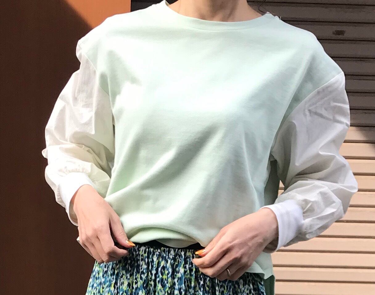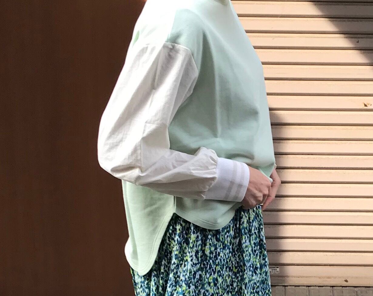 本体は綿のスウェット地で、お袖は異素材のボリューム袖が個性的なプルオーバーです。