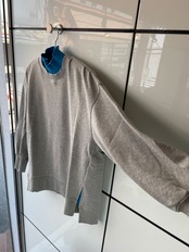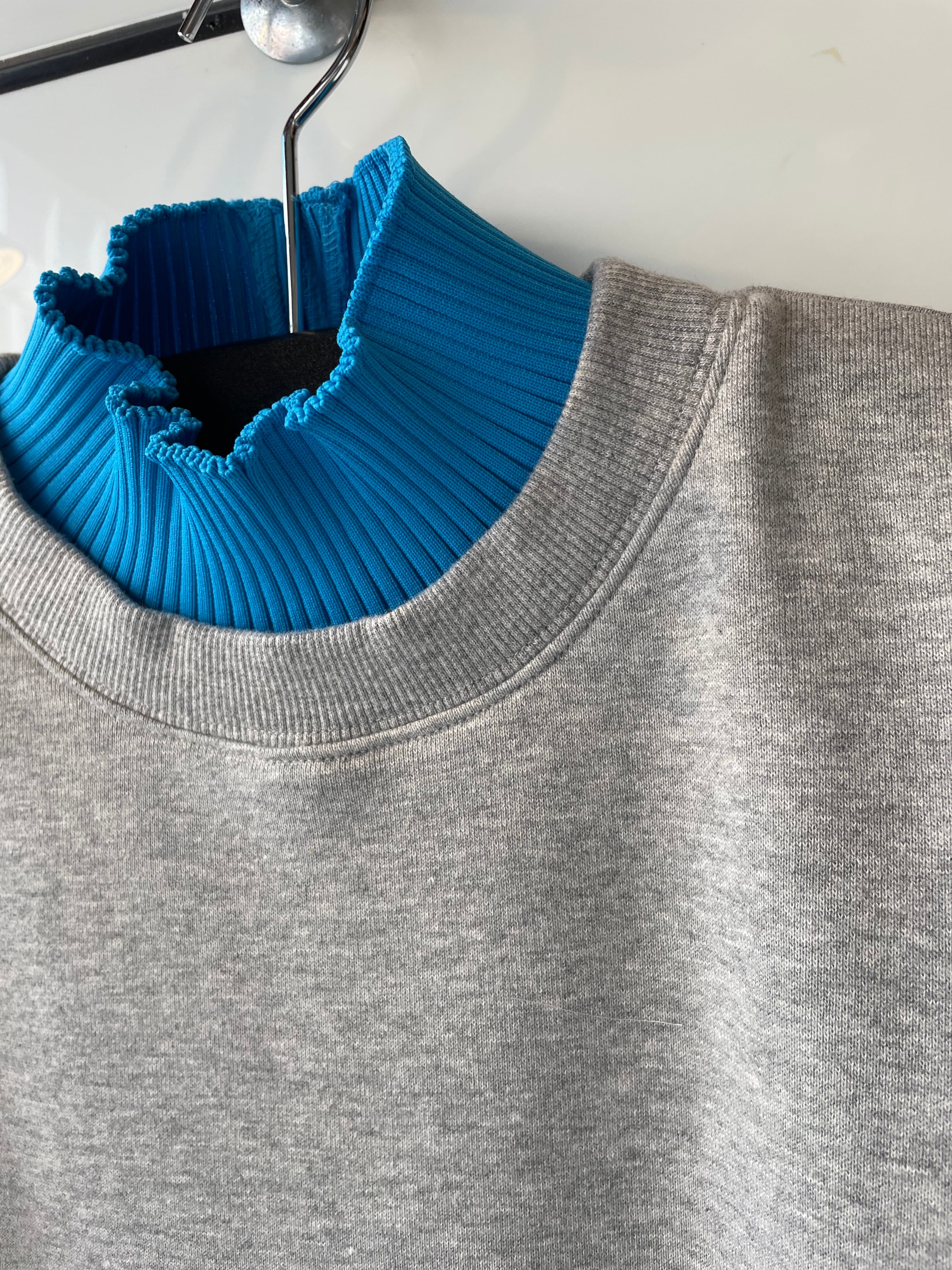 襟と裾に配色のリブ地をあしらった、プルオーバーです。
